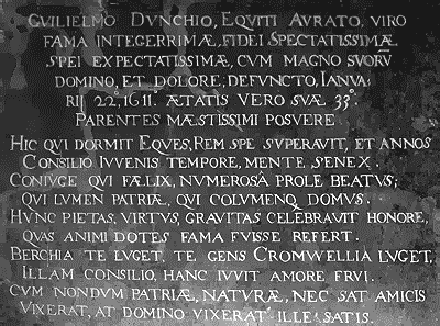 The Dunch Mortuary Chapel stood on the south side of the chancel of Little Wittenham Church until the building was almost entirely rebuilt in 1862. Of the many monuments to the family housed there, the prize was this costly monument of marble and alabaster, with the effigies of Sir William Dunch in armour and his lady, erected against the west wall. Old illustrations show the monument was once more elaborate than it is today, but its repositioning below the tower have made some adjustments necessary. Sir William (d. 1612) was the son of Sir Edmund Dunch, Kt, MP of Little Wittenham Manor, by his wife Anne, daughter and heir of Nicholas Fettiplace. He was MP for Wallingford in 1603, being knighted by King James I in the same year, at the house of George Fortescue, Esquire. He married Mary, fourth daughter of Sir Henry Cromwell, Kt (d. 1603) of Hinchinbrooke, Huntingdonshire, by his first wife Joan, daughter and heir of Sir Ralph Warren, Lord Mayor of London in 1536 and 1543. Mary was the aunt of the Protector, Oliver Cromwell, and the patriot, John Hampden. William died within his father's lifetime at the age of only thirty-three. The issue of the marriage were four sons and five daughters, as depicted on the base of the monument. The eldest son was Sir Edmund Dunch who became Lord Burnell of East Wittenham.