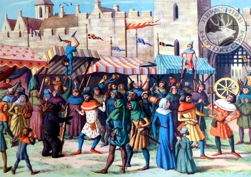 The GreatReading Fairs Trade & Revelry in the Middle Ages & Beyond Every year, four fairs were held in Reading. Candlemas Fair (2nd February), May Fair (1st May) and St. James' Fair (25th July) were chiefly cattle fairs. From all parts of the country droves of horses and oxen arrived at Reading, and dealers carried on brisk business. So numerous were the cattle that, in 1840, it was found necessary to hold St. James's Fair, not in Friar Street and Broad Street as hitherto, but in the Forbury. The fourth fair was the Michaelmas Cheese Fair (25th September). This fair was originally for the sale of hops and serges as well as of cheese and, formerly, it used to be held in the old Cheese Row. As early as 1697, however, it was necessary to move it to the Forbury. Between 1750 and 1850, owing to the improved roads and waterways, and owing to the central position of Reading, the fair became one of the principal cheese fairs in the country. From the dairy farms of Gloucestershire, Somerset, Wiltshire and Dorset, as well as Berkshire, hundreds of waggons and barges brought cheese to Reading. The carters often took back with them loads of birch brooms, which they sold in the towns and villages as they went home. The Cheese Fair seems to have reached its highest note about the end of the 18th century. In 1795, it was recorded that 1,200 tons of cheese were offered for sale in the Forbury. This amount of cheese would be worth £60,000. During the next fifty years, the amount of cheese brought to the fair each year varied from 500 to 1,000 tons. The opening of railways seems to have caused the amount of cheese shown in the Forbury to diminish, for the custom arose of leaving it unloaded in the trucks, and of selling it by sample. Michaelmas Fair brought together a multitude of people. It was a fair at which servants were hired. Hundreds of farm servants, both men and women - shepherds, waggoners, dairymaids, milkmen, ploughmen, woodmen and others - came to the fair to seek employment, or a change of masters. They stood in long lines while the farmers went up and down, picking and choosing amongst them. Cattle from Scotland, ponies from the Shetland Islands, from the New Forest or from Wales, were also to be seen, and there were dealers, cheap-jacks and showmen of all kinds. The Forbury was crowded, not only with stands of cheese, but with stalls, booths, swings, roundabouts, peep-shows, wild beasts in cages and other wonders. For many years the fair used to be visited by Wombwell's Menagerie. Pickpockets and sharpers of all kinds mingled with the crowd, and usually reaped a good harvest. Edited from W.M. Childs' "The Story of the Town of Reading" (1905)